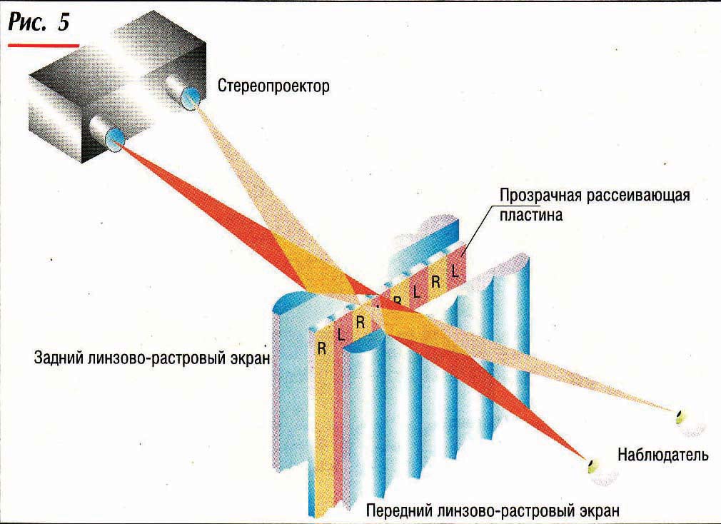 Еще одна «вариация на тему» — двойной линзово-растровый дисплей. Он приспособлен для оснащения стерео-проекционных систем. В случае задней проекции две пластины с вертикальными линзами прецизионно выставляются строго друг напротив друга так, чтобы лучи света от правого проектора, пройдя через них, попадали только в правый глаз, а от левого — только в левый. Чтобы обеспечить работу нескольких пользователей, устанавливают большое количество стереопроекторов (до 40). Поскольку каждый луч света проходит через несколько соседних линз, то формируется сразу несколько смежных зон просмотра (рис. 5).