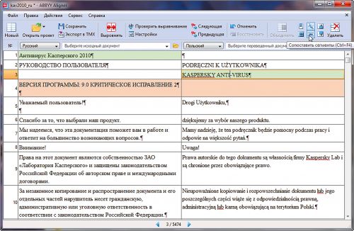 Естественно, механическое сопоставление по порядку предложений в исходном и переведенном текстах не способствует созданию качественной БД параллельных фрагментов – разные языки имеют свои особенности. ABBYY Aligner использует словарные базы и сравнивает сегменты исходного и переведенного текстов, что позволяет повысить качество. По результатам экспресс-тестирования на достаточно больших текстовых документах (руководства пользователя размером свыше 150 страниц на английском, польском и русском языках), можно сделать заключение, что программа действительно выявляет отсутствующие или неточно совпадающие сегменты в пределах одного-двух абзацев и правильно находит соответствия. Хотя, конечно, если в одном из входящих документов пропустить страницу-другую, вряд ли стоит рассчитывать на отсутствие ошибок. Имеется и еще один нюанс – иногда приложение принимает точки в сокращениях (т. е., пр.) как окончание предложения и, соответственно, неверно выделяет сегмент. Чтобы избежать ошибок подобного рода, в окне настроек для каждого используемого языка можно задать собственный список сокращений. Впрочем, даже если этого не сделать, программа сама просигнализирует о некоторых неточностях или «сомнениях» – не полностью (по мнению Aligner) совпадающие сегменты выделяются в окне редактора подцветкой, как и пустые строки и орфографические ошибки. Дополнительные инструменты редактора позволяют разбивать или объединять сегменты текста, перемещать их, выполнять сопоставление вручную и, естественно, править обнаруженные ошибки.