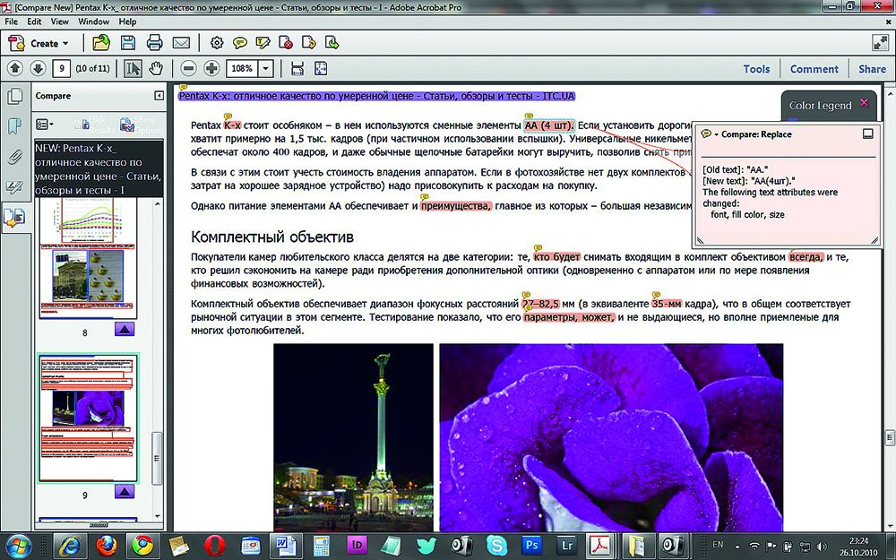 Также улучшена функция сравнения двух PDF-документов. Опция Compare text only позволяет посмотреть изменения только в тексте, не отвлекаясь на бесконечные уведомления о добавленной/исчезнувшей графике и т. п. В качестве теста сопоставлялся оригинал статьи (сконвертирован из Word-файла) для сайта itc.ua с размещенным на нем вариантом. Преобразование веб-страниц осуществлялось в Internet Explorer (инструментом Convert to PDF, который появляется после инсталляции Acrobat X), и для задач поиска различий оно прекрасно подходит, поскольку многие второстепенные элементы были отброшены. Однако если требуется как можно точнее сохранить внешний вид (например, для архива), то всю процедуру следует выполнить в Acrobat X (или воспользоваться бесплатным сервисом, например, www.web2pdfconvert.com).