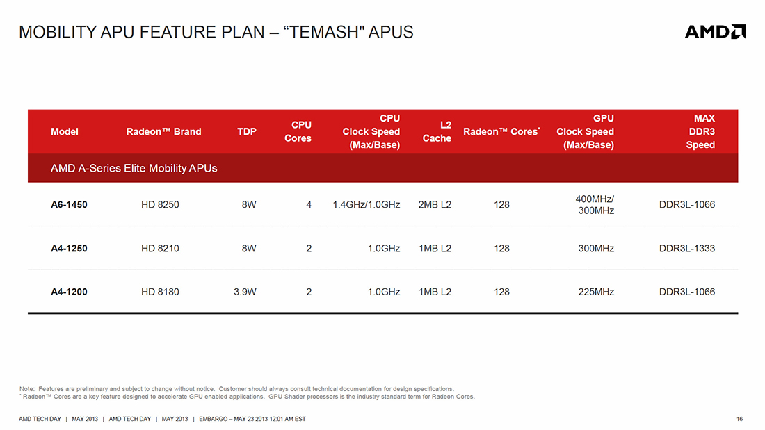 Процессоры Temash представляют собой урезанную версию чипов Kabini с более низкими значениями TDP (от 3,9 до 8 Вт). Всего представлено три чипа линейки: четырехъядерный A6-1450 и двухъядерные A4-1250 и A4-1200.