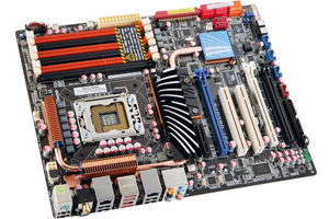 Как и следовало ожидать, первые модели материнских плат, предназначенных для новых процессоров Intel семейства Core i7, в большинстве своем относятся к высшему ценовому диапазону и ориентированы главным образом на компьютерных энтузиастов. Материнская плата ASUS P6T Deluxe OC Palm edition основана на чипсете Intel X58, в состав которого входит южный мост ICH10R. Помимо шести портов SATA, реализованных с его помощью, на плате имеется контроллер SAS на базе Marvel 88SE6320, поддерживающий два диска с возможностью объединения в RAID 0, 1. Наличие шести разъемов для оперативной памяти DDR3 обусловлено применением в старших моделях CPU Core i7 трехканального контроллера памяти, максимальный поддерживаемый объем которой согласно спецификациям производителя составляет 12 ГБ.