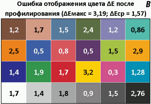 Стабильность цветовой температуры не слишком хороша, так как она постепенно растет с понижением интенсивности полутонов. Величина отклонения dE на плашках ColorChecker24 после профилирования находится в приемлемых рамках, не выходя за общепринятые.