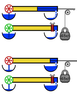 Вот две системы, перекачивающие литр воды из левой чаши в правую по трубе сечением 10 кв. см.