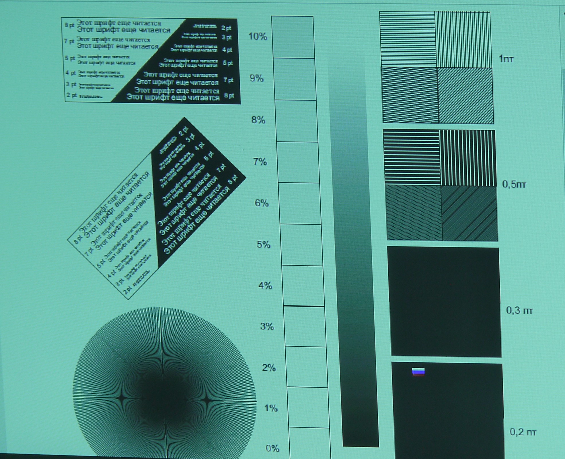 В программу мини-тестирования мы включили исследование возможностей модели XJ-V2 по выводу сложных изображений, содержащих шрифты различного размера. Это особенно актуально для аппарата с разрешением XGA (1024x768), который с помощью встроенных средств умеет масштабировать картинки с максимальным размером 1600x1200. Как видно на приведенном снимке экрана, куда проецировалось тестовое изображение, хорошо различимы надписи, сделанные шрифтом 7 пт, тогда как 5 пт уже начинает размываться. Это говорит о хорошей проработке алгоритмов масштабирования, реализованных в аппарате.