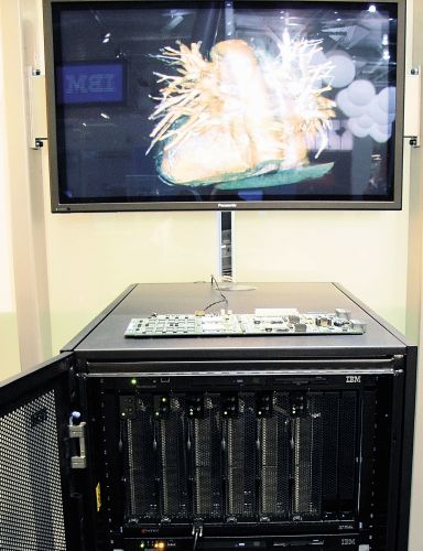 На стенде IBM демонстрировалась работа стойки blade-серверов, построенных на процессоре Cell. В качестве приложения, которое должно показать всю мощь этого CPU, использовался пакет, предназначенный для визуализации в реальном времени данных, получаемых от томографа. Прежде такая задача считалась практически неразрешимой для компьютеров архитектуры x86, и вряд ли в ближайшем будущем ситуация изменится.