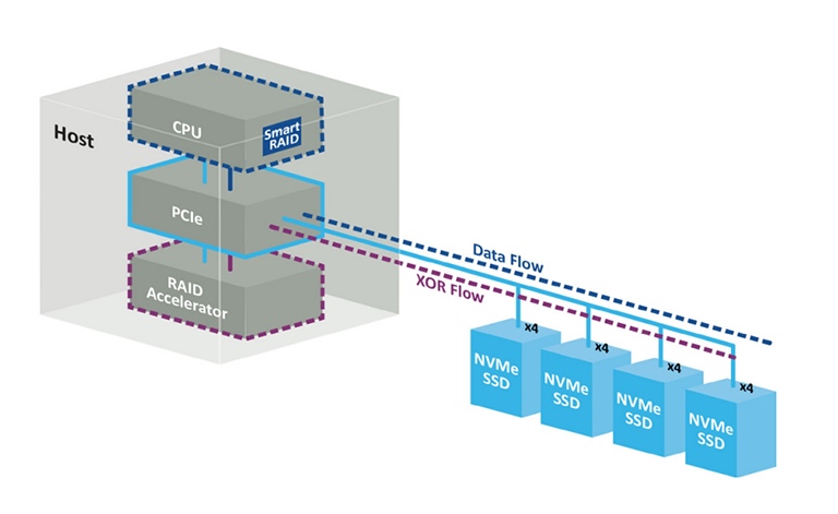 Перше для компанії програмно-визначене RAID-рішення побудоване на чіткому розподілі ролей: центральний процесор сервера спрямовує потік даних безпосередньо до NVMe-накопичувачів, підключених через шину PCIe, тоді як Adaptec SmartRAID 4300 бере на себе обчислення паритетних даних XOR і розподіляє їх між дисками.
