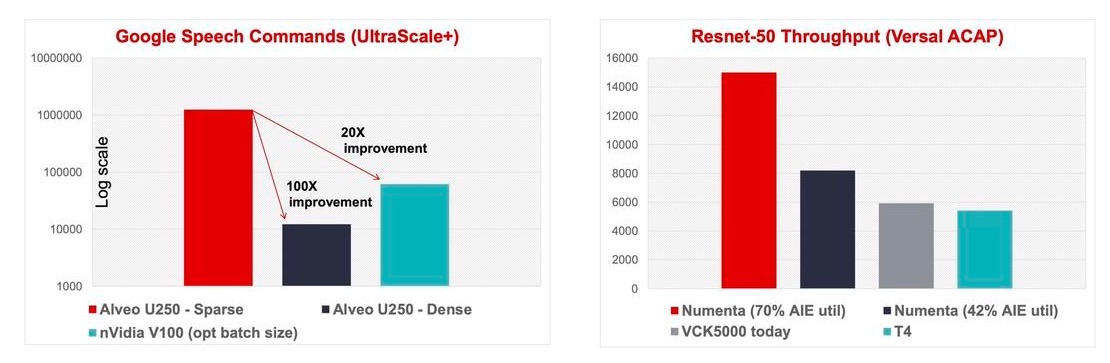По данным, представленным Numenta в ноябре, карта Xilinx Alveo смогла в 100 раз превзойти GPU Nvidia V100 по скорости правильного распознавания слов в Google Speech.