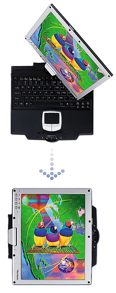 Другая интересная новинка -- ViewSonic V1250 -- является самым легким, по утверждению создателей, трансформируемым ноутбуком на платформе Tablet PC, который снабжен дисплеем с размером диагонали 12,1 дюйма. Система, использующая технологию Intel Centrino, имеет массу порядка 1,8 кг и предлагается в комплекте с обширным набором дополнительного ПО. Ее рекомендованная розничная цена установлена в размере от $1795.