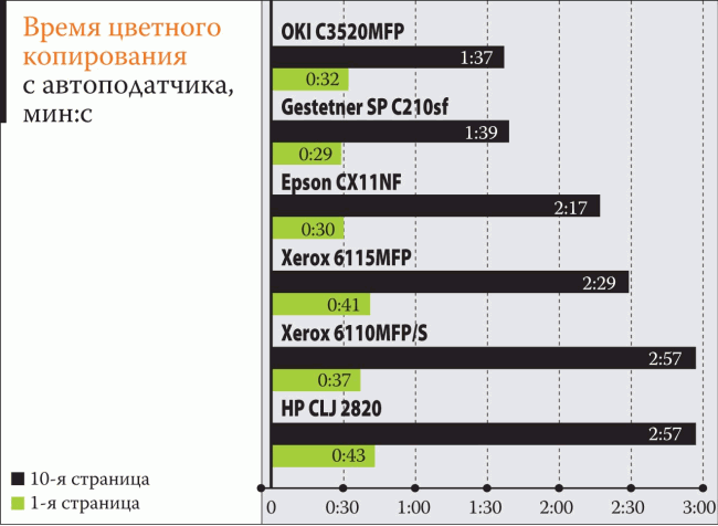 Из числа остальных участников испытаний практически каждый имел некую особенность, выделявшую его из общего ряда, но по совокупности технических характеристик никто не стал лучшим. Тем не менее стоит отметить Epson Aculaser CX11NF, Gestetner SP C210sf, Xerox Phaser 6115MFP за отличную производительность монохромной печати и копирования и хорошую в цвете, кроме того, они имеют высокое разрешение вывода и неплохую экономичность.