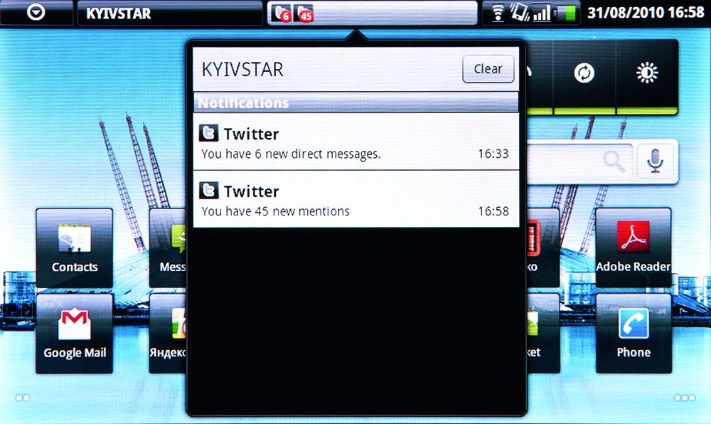 В интерфейсе Streak активно используются нетипичные для Android элементы – всплывающие окна. Они довольно давно появились в SDK, но разработчики применяют их пока крайне редко. А с такой диагональю, как говорится, сам бог велел. Теперь в строке состояния доступны разные выпадающие меню – не только с уведомлениями, но и настройками, будильниками и т. д. Даже главное меню может первоначально разворачиваться в короткий список избранных приложений, не закрывая в то же время весь рабочий стол. Самих десктопов в системе шесть, единственная ориентация для них – альбомная. Ну а в других меню и программах предусмотрен автоповорот экрана в портретный режим. В остальном интерфейс типичен для Android 2.1. Именно эта версия ПО уже доступна к загрузке, хотя изначально устройство поставляется с 1.6, что можно считать недостатком. Интерфейс все еще нуждается в адаптации к большой диагонали. Например, нелепо выглядит переход в стандартный полноэкранный текстовый редактор при наборе в альбомной ориентации, ведь места на дисплее более чем достаточно, чтобы оставить видимой часть окна приложения.