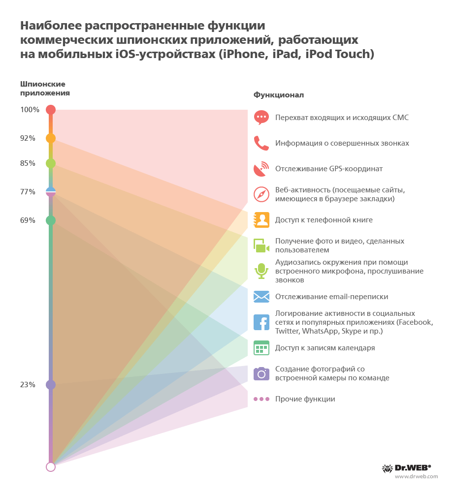 На данный момент вирусная база Dr.Web содержит более 50 записей для шпионских iOS-приложений, которые принадлежат к 15 различным семействам.