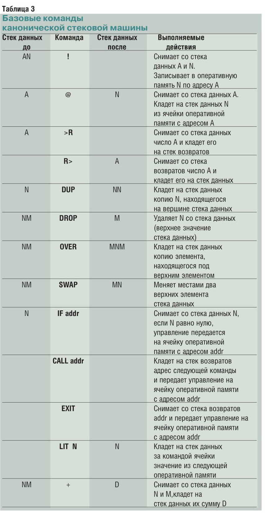Самым, пожалуй, замечательным в стековых машинах является не столько простота реализации, сколько простота понимания принципа работы. Если исключить очевидные арифметические и логические команды (сложение, вычитание, битовые операции и пр.), система команд стековой машины включает в себя всего лишь 12 базовых инструкций (табл. 3). Мнемоническое обозначение команд (фактически, язык ассемблера) стековой машины принято заимствовать из FORTH-системы. Все команды уникальны для стековой архитектуры и предельно просты. Их можно объяснить даже восьмилетнему ребенку (личный опыт автора). Кстати, радетели современного образования и просвещения, сколько можно калечить бедных детей обучением никому не нужному и совершенно бездарному языку Basic?