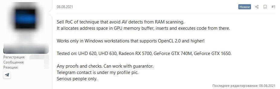 На одном из хакерских форумов появилось сообщение, предлагающее на продажу концептуальный код (Proof-of-Concept, PoC) метода, который размещает вредоносный код в буфере памяти GPU, скрывая его от средств безопасности, сканирующих системную оперативную память.