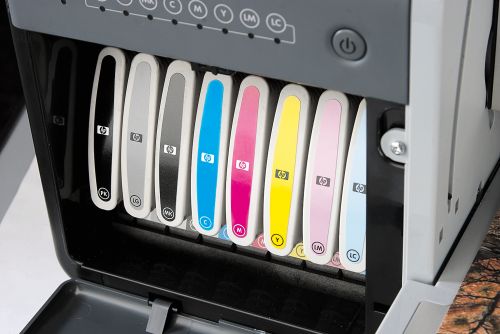 Неподвижные раздельные картриджи восьми цветов – PhotoK, LightG, MatteK, C, M, Y, LightM, LightC с пигментными чернилами HP Vivera с помощью трубок соединены с четырьмя перемещающимися вдоль листа головками, которые, в свою очередь, оснащены 1056 соплами для черных чернил и таким же количеством – для каждого из цветных. Поскольку в наборе картриджей присутствуют три степени насыщенности серого, можно сделать вывод, что особое внимание уделено печати черно-белых фотоснимков.