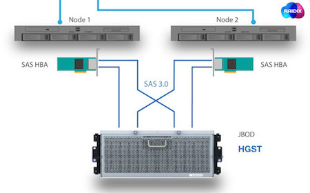 NAS-кластер под RAIDIX отличается от FC-кластера внешними интерфейсами (ставятся 10-40Gb Ethernet NICs) и файловыми протоколами общения с клиентами (SMB, NFS, AFP). По устройству серверных узлов и со стороны дисков (back-end) они идентичны: к узлам кластера многоканальными SAS HBA подключается совместное хранилище с дисками (Shared SAS JBOD) и настраивается синхронизация узлов, тоже по SAS.
