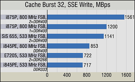 Здесь нам, как и в прошлый раз, помог разобраться с особенностями функционирования чипсетов тест Cache Burst 32. В общем-то, комментарии не имеет смысла делать особенно длинными, так как картина довольно прозрачна. Во-первых, по скорости чтения i875P в двухканальном режиме просто-напросто "разгромил" всех и вся. Скорость 4,2 GBps по сравнению с предыдущим самым большим результатом в 3,3 GBps -- это действительно рывок вперед, причем рывок настолько очевидный и сильный, что эпитеты приходят в голову только одного плана: "сенсационно", "великолепно", "невиданно"... ну и так далее. Превосходство в скорости записи также сильное, но тут уже акценты немного сместились, потому что в данном случае мы наблюдаем не просто победу одной платформы от Intel над другой, а (к слову -- предсказанную нами!)