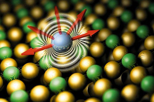 | Одноатомный строительный блок для хранения данных: иллюстрация преимущественной магнитной ориентации атома железа на специально подготовленной медной поверхности. Способность атома к управлению своей магнитной ориентацией может помочь определить его пригодность для хранения данных |