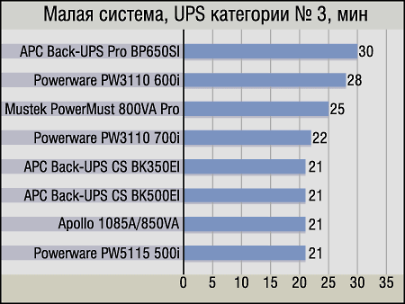 Выделять "чемпиона" в данной группе нам показалось излишним, так как здесь собралось достаточное количество ИБП, которые, положа руку на сердце, также трудно рекомендовать для мощных компьютеров. Да, они "смогли сделать это" -- за что честь им и хвала, однако владелец ПК подобной конфигурации вряд ли уже настолько стеснен в средствах, чтобы приобретать ему в пару что-нибудь типа APC Back-UPS CS BK325-RS -- устройство хорошее, но предназначенное для несколько иного класса машин. Поэтому, несмотря на кажущуюся парадоксальность такого подхода, мы бы рассматривали данную диаграмму как список UPS для малых систем, дополнительно подтвердивших свои положительные качества, "вытянув" вполне существенное время и большой компьютер.
