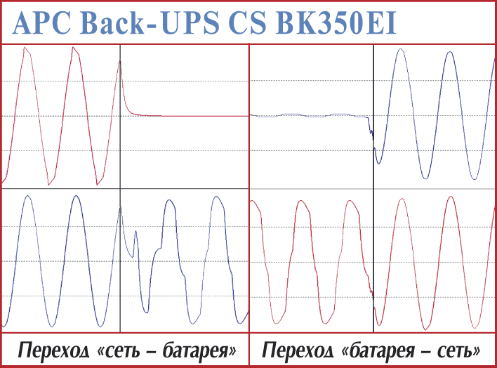 Эта серия устройств пришла на смену Back-UPS CS и призвана защищать нагрузку в наших условиях хронических аномалий питающей сети, когда предыдущие источники бесперебойного питания либо постоянно переключались с сети на батарею, либо игнорировали снижение напряжения в пределах выше разумного. Что касается исследуемых нами временных интервалов, то для перехода на батарею они остались практически без изменений -- 4 мс. Сам переходной процесс при возврате ИБП на сеть продлился менее 1,8 мс.