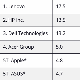 Попри те, що рейтинг серед 3 найкращих компаній не змінився, Apple все ж таки сповзла на п’яте місце, майже зрівнявшись з ASUS, оскільки виробництво впало протягом кварталу. В результаті Acer опинилася на 4 місці в цьому циклі. За винятком подальших проблем із постачанням, IDC очікує, що Apple збільшить виробництво у другій половині року.