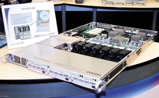 Если первые версии мобильных процессоров Pentium M использовались в компактных серверах практически «полулегально», то с нынешнего года мощные и малопотребляющие мобильные чипы получили вполне законную прописку в серверах. Двухъядерный процессор с кодовым названием Sossaman, являющийся серверной версией Core Duo, был официально выпущен после IDF и даже назван Xeon LV (Low-Voltage), но и на самом форуме он демонстрировался повсеместно. Supermicro и Tyan представили свои серверы начального уровня формата 1U, рассчитанные на работу двух таких CPU, и гордо красовавшаяся надпись «31 Wt» (энергопотребление процессора) привлекала немало внимания. Естественно, был показан и Woodcrest – первый серверный процессор новой микроархитектуры, ожидаемый в III квартале текущего года.