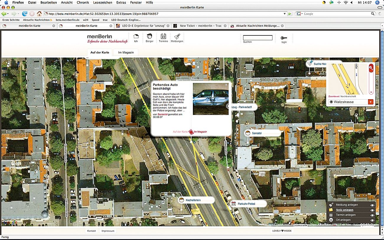 Пресытились царящим в блогосфере эскапизмом? Считаете жизнь виртуальных сообществ вредоносной иллюзией, разобщающей нас с ближними? Испробуйте mashup-сервис MeinBerlin, созданный на базе Google Earth! Он вводит в реальную жизнь берлинских микрорайонов законы, присущие играм в жанре MMORPG. Его пользователи могут быстро найти обитателей соседнего квартала, имеющих сходные интересы, не пропустят дворовой футбольный матч и дадут организованный отпор нарушителям (надпись в «облачке» с фотографией помятого автомобиля призывает откликнуться свидетелей ДТП) |
