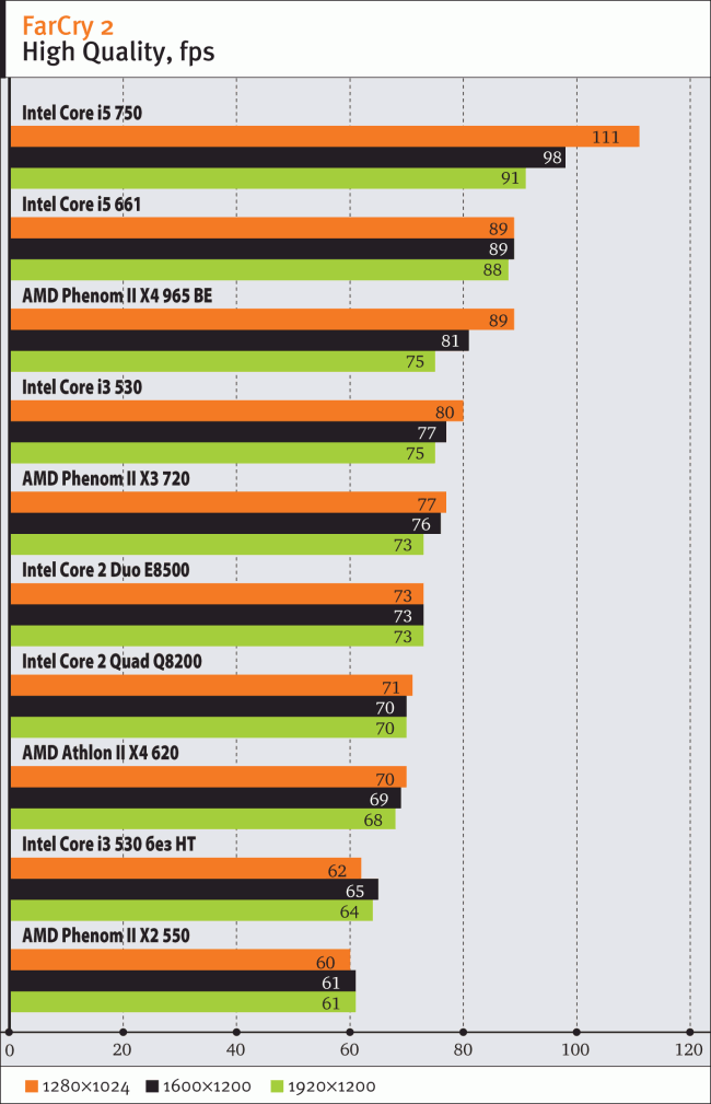 Одной из немногих современных игр, поддерживающих четырехъядерные процессоры, является FarCry 2. Даже не на максимальных настройках она полностью загружает работой четырехъядерный Core i5 750, однако новый Core i5 661 практически не остает от значительно более мощного собрата: разницу в 2 кадра в секунду при обеспечиваемых данной платформой 89 можно считать пренебрежимо малой, хотя процессор при этом уже явно ограничивает общую производительность. Ближайшим соперником оказывается AMD Phenom II X4 965 Black Edition, однако отставание его от Clarkfield довольно значительно и растет с повышением разрешения. Core i3 также прекрасно показывает себя, опережая как все процессоры AMD из своего класса, так и абсолютно все модели Intel предыдущего поколения.