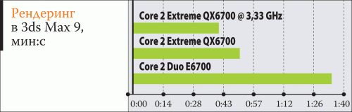 А вот простой и эффективный путь размещения двух кристаллов Conroe на одном CPU, напротив, выглядит весьма привлекательно. Конечно, о массовой востребованности четырех ядер говорить пока рано, так как достаточный эффект наблюдается лишь в оптимизированных приложениях. Например, до выхода обещанных в 2007 г. игр с поддержкой многопотоковости геймеры скорее всего приобретут более дешевый Core 2 Duo с аналогичной частотой. Зато для профессиональных пользователей и энтузиастов обработки видео QX6700 позволит достичь производительности, ранее возможной только на дорогостоящих многопроцессорных рабочих станциях. И если отталкиваться от скоростных показателей таких программных продуктов, как 3ds Max и Adobe Premiere, то достигнутый за год прогресс впечатляет, особенно в сравнении практически с топтанием на месте в период 2003–2005 гг. – в некоторых случаях быстродействие выросло вчетверо. И, судя по всему, это еще не предел.