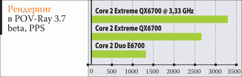 Первые CPU серии Extreme Edition действительно наибольшую пользу приносили геймерам и домашним пользователям, таким образом, полностью соответствуя своему названию. Нынешний же десктопный флагман Intel, напротив, интересен в первую очередь в качестве замены в рабочих станциях высокого уровня. Причина проста: программное обеспечение для профессионального применения годами оптимизируется под многопотоковые вычисления, благо в сегменте рабочих станций SMP-конфигурации являются вполне привычными. Лучшей иллюстрацией служит результат тестирования в 3ds Max 9, где преимущество Kentsfield над и так исключительно быстрым Conroe составляет более 85%. Схожие показатели прироста демонстрирует и пакет для raytracing-рендеринга POV-Ray 3.7. А вот Photoshop CS2 показывает другую картину, прибавляя всего лишь около 10% производительности.