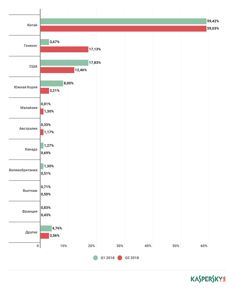 Лидирующее положение по числу атак сохраняет Китай (59,03%), на втором месте оказался Гонконг (17,13%). Он же вошел в тройку лидеров (12,88%) по количеству уникальных мишеней, уступив Китаю (52,36%) и США (17,75%).