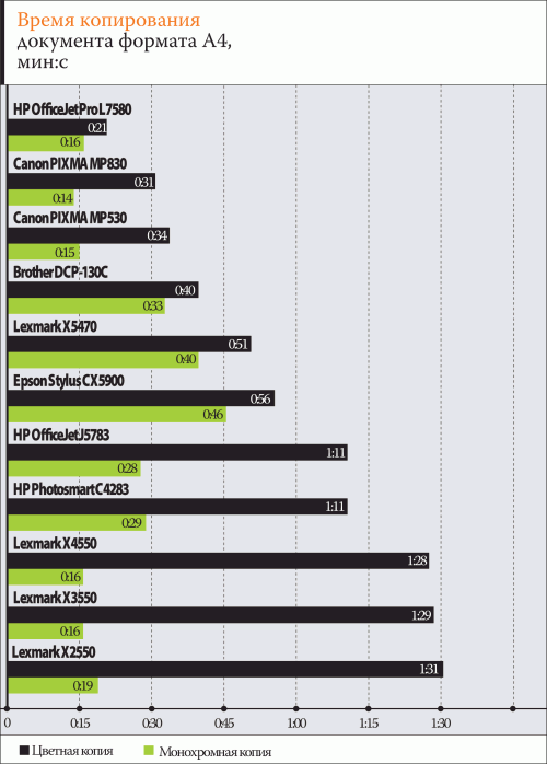 Учитывая направленность тестируемых МФУ (печать с компьютера текстов, бизнес-графики, сканирование и автономное копирование документов и цветных изображений), мы использовали пять групп тестов: две на измерение времени выполнения, две – на качество, а также ресурс-тест. В первую группу вошли: вывод 10-страничного мультишрифтового монохромного документа в формате Microsoft Word (с принудительным использованием только черных чернил), 10-страничного цветного PDF-документа с множеством графических элементов. В драйверах устанавливались настройки нормального качества, обычно это были параметры по умолчанию. Измерялись два временныóх интервала: один от отправки на печать до выхода первой страницы, второй – до завершения всего задания. Перед выводом каждого из документов запускалась так называемая «прогревочная» страница, что позволяло исключить из результата время подготовки механизма. На диаграмме с показателями потоковой скорости приведены лучшие значения для каждого аппарата.
