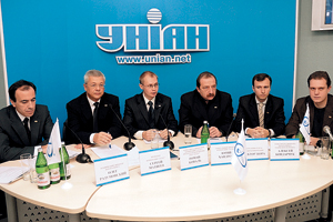| В конференции участвовали все топ-менеджеры корпорации (слева направо): Олег Разумовский, Сергей Матвеев, Роман Коваль, Юрий Хандрос, Виктор Жора и Алексей Бондарчук |