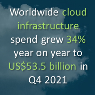 По итогам четвертого квартала 2021 г. общемировой объем расходов на облачные инфраструктурные услуги впервые преодолел рубеж в 50 млрд долл. Согласно подсчетам Canalys, при росте на 34% "YoY" за год расходы выросли с 13,6 до 53,5 млрд долл.