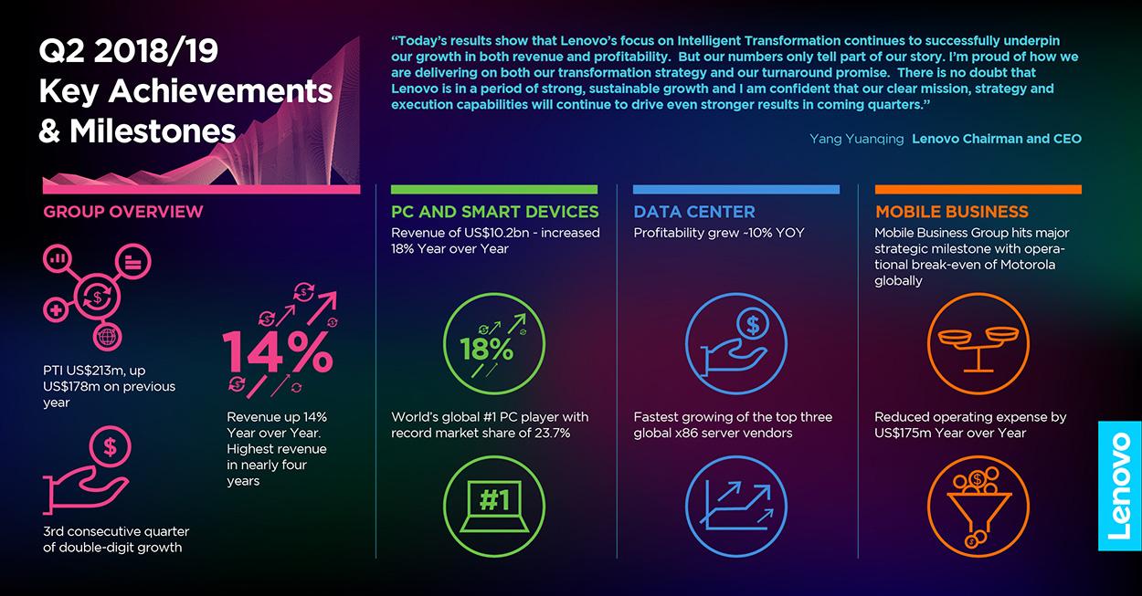 Lenovo по итогам второго квартала финансового года получила выручку на уровне 13,4 млрд долл., что на 14% больше в годовом сравнении. Это уже третий подряд двузначный рост для компании и рекордный показатель за почти четыре последние года.