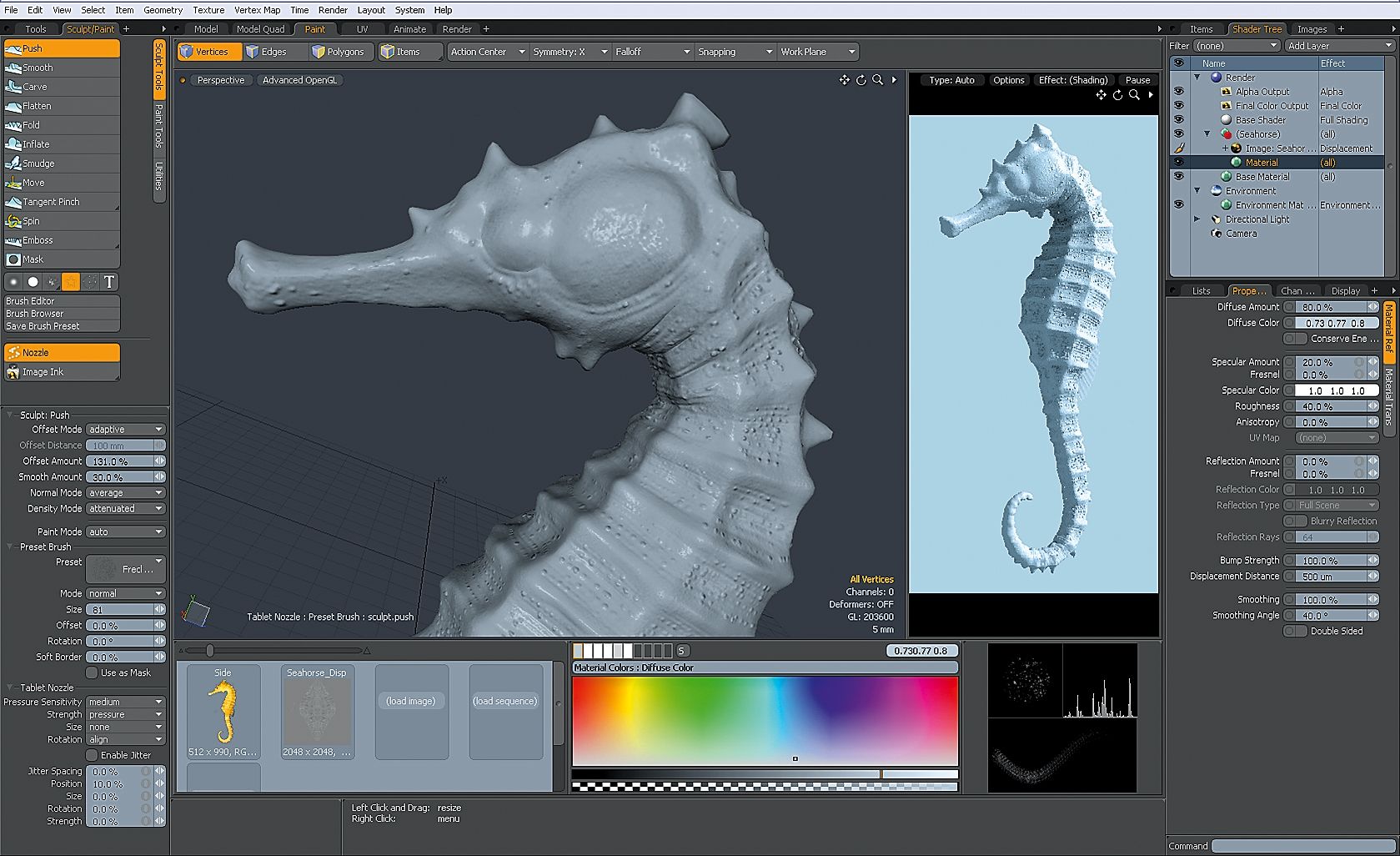 Произвольная обработка «цифровой глины» возможна двумя способами. При активизации первого (Mesh-based Sculpting) совершается кардинальное изменение полигональной сетки модели, в результате чего из начальной сферы в грубом виде изготовляется законченный элемент, к примеру голова. Силами режима Image-based Sculpting происходит добавление финальных штрихов: нанесение на поверхность важных деталей полигональной оболочки – микронеровностей, рубцов, складок и т. п. Широкий выбор непрерывно дополняемых новыми вариантами рабочих параметров кистей, а также точная интерполяция между их проходами, делает процесс лепки точнее, а формообразующие мазки более гладкими.