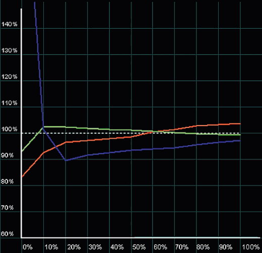 В программу измерений второго тура входило получение графика относительного уровня цветовых компонентов, демонстрирующего, насколько красная, синяя и зеленая составляющие отклоняются от нейтрального эталонного значения, а также подробный график значения гаммы по шкале серого – в идеале он должен представлять собой прямую линию на уровне ∆ = 2,2, однако на практике, как обычно, выявилась масса сюрпризов.