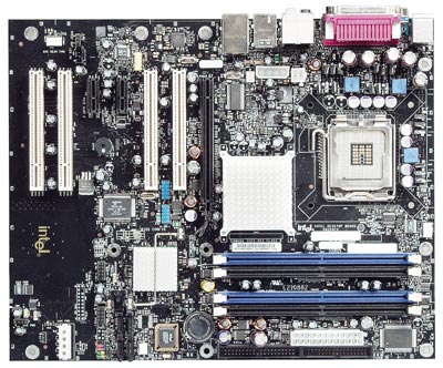 Платы от Intel, попавшие к нам задолго до начала данного тестирования, были "первыми ласточками" новой платформы. D915PBL -- один из вариантов решения от Intel на базе i915P. Это классическая по компоновке плата, выполненная полностью в духе предыдущих изделий компании. Отсутствие охлаждения на VRM абсолютно не удивляет -- так было всегда, и, судя по всему, радовать подобными "ненужными" довесками в продуктах этого класса Intel нас не будет.