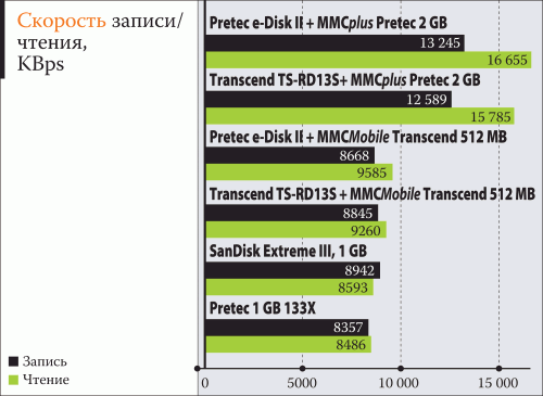 Ну а теперь о том, как ведут себя карты нового формата в соответствующих устройствах считывания. Нами было выбрано два ридера – Pretec e-Disk II, оптимизированный для работы с MMCplus картами и полностью отвечающий требованиям нового стандарта (он содержит только слот для SD/MMC), и Transcend TS-RD13S – новый продукт известного производителя, но относящийся к семейству считывателей Multi-Card. В роли испытуемых выступали карты Pretec MMCplus объемом 2 GB и Transcend MMCМobile емкостью 512 MB.