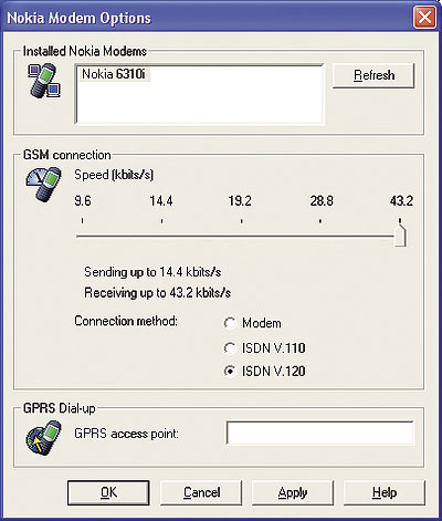 После запуска на экране появился запрос на выбор одного из трех типов соединения. При этом система предупредила, что Bluetooth-модем недоступен, поскольку не установлен фирменный адаптер Nokia Connectivity Card DTL-4. Мы выбрали связь через IrDA, решив, что "синезубый" можно установить позже вручную. По окончании процесса установки в списке модемов, которые известны системе, появился Nokia 6310i.