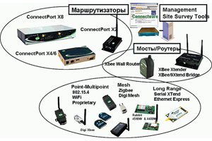 В рамках разработанной Digi International архитектуры Drop-in Networking компания предлагает законченное решение для проводного/беспроводного (ZigBee, Wi-Fi, GSM/GPRS/EDGE и 3G) защищенного соединения электронных устройств, особенно конкурентоспособное в местах, где нецелесообразна прокладка кабельной инфраструктуры. Экосистема Digi Drop-in Networking (рисунок) включает в себя сенсоры, XBee-адаптеры, IP-шлюзы линейки ConnectPort X и ПО Connectware Manager и предоставляет возможности быстрого развертывания беспроводных интеллектуальных сенсорных сетей.