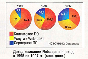Сегодня разработчики приложений от текстовых редакторов до сложных СУБД все больше и больше ориентируются на Web-технологии. И от того, какой именно механизм броузера используется для этого, может быть жизненно важным для производителей не только самого броузера, но и серверного программного обеспечения. А основной доход Netscape при- Доход компании Netscape в период с 1995 по 1997 гг. (млн. долл.) носят именно продажи серверного ПО и связанных с ним услуг, и она намерена впредь фокусироваться на сложных решениях типа электронной коммерции и intranet-проектах.