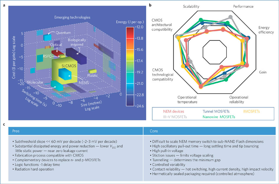 В статье, появившейся в последнем издании Nature Nanotechnology, сотрудники Машиностроительной школы Мак-Кормика при Северо-Западном университете подвели итог десятилетним исследованиям в этой области, определив основные трудности и наиболее актуальные направления дальнейших работ. Так, например, они продемонстрировали методы получения массивов из миллионов таких наноструктур и то, как их можно адаптировать для массового производства гибридных устройств NEM-КМОП.