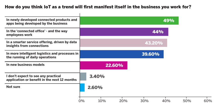 Как видно, единого мнения о том, где компании станут применять IoT, пока нет. Очевидно, что непременно в продуктах, предусматривающих непосредственный контакт с физическими объектами (по самому определению IoT). Для организации виртуального присутствия удаленных сотрудников. В «умных сервисах». В «более интеллигентной логистике». А вот как вплетать IoT в новые бизнес-модели, пока не слишком понятно.