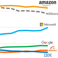 Amazon и Microsoft продолжают совместно удерживать свыше половины рынка, причем последняя впервые взяла под свой контроль его пятую часть. На протяжении последнего четырехлетнего периода за Amazon стабильно остается 32-34% рынка. Помимо лидеров в активной борьбе за рынок также участвуют IBM, Salesforce, Tencent, Oracle, NTT, Baidu, SAP, Fujitsu и Rackspace. В то же время, небольшие облачные провайдеры продолжают сдавать позиции — за последние шестнадцать кварталов их коллективная доля сократилась на 13%.