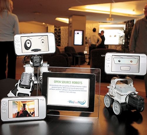 Насколько легко создавать ПО для Linux-платформы, под управлением которой работают интернет-планшеты Nokia, демонстрировали роботы. «Лицами», а также управляющим центром для них служили все те же Nokia N800. |