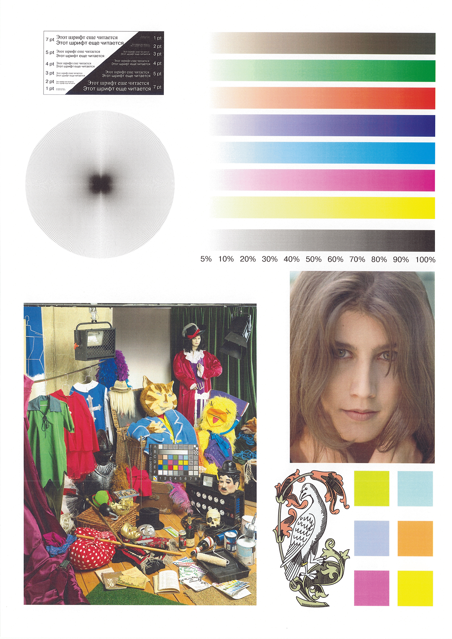 Теперь о результатах тестирования нового МФУ на качество вывода. Наш документ был отпечатан с максимальными настройками, чтобы убедиться в потенциале аппарата. Как видно на приведенной иллюстрации, с задачей модель справилась отлично. На мире весьма компактный центр, а лучи не содержат изломов. Мелкий текст хорошо читается при размере кегля 2 пт на варианте печати черным на белом фоне, и еще различим при том же размере на выворотке. Градиентные заливки равномерны при всех уровнях плотности, и лишь при использовании зеленого цвета в районе интенсивности 20% была получена едва заметная ступенька. Проработка телесных оттенков на фото весьма естественна, причем сочетается с хорошей детализацией. И на основании данного теста мы сделали вывод, что аппарат OKI MC853 должен справиться со всеми наиболее широко распространенными в бизнесе задачами.