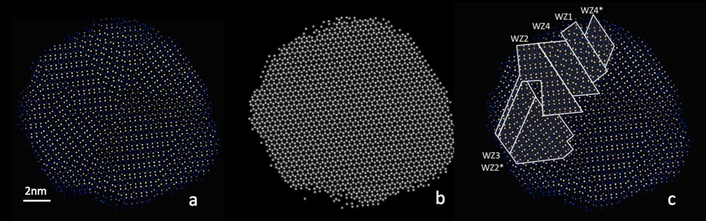 Каким образом эти несколько структур могут сосуществовать стало ясно после получения в ORNL изображений наночастиц с атомарным разрешением. На них видно, что все атомы образуют идеальную гексагональную решетку Браве, но атомы индия и меди формируют серию областей, где их взаимное расположение различно. Границы между этими зонами аналогичны границам между зернами в поликристаллические материалах.