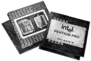 О Pentium Pro (ранее называвшемся Р6) сказано уже немало, стоит лишь напомнить, что на одном кристаллодержателе этого микропроцессора размещены как сам процессор, так и кэш-память второго уровня (L2), состоящие из 5,5 млн и 16 млн транзисторов соответственно. В основе процессора лежит новая технология динамического исполнения команд. Еще одной существенной и немаловажной характеристикой является поддержка режима многопроцессорности. Хайнц Криер отметил, что при создании Pentium Pro особое внимание уделялось максимальному упрощению последующего проектирования систем на его основе. Поскольку в новом микропроцессоре кэш-память второго уровня интегрирована на одном кристалле с процессором, автоматически решается одна из основных проблем разработчиков - эффективный обмен данными между основной памятью и кэш-памятью, а также между кэш-памятью и процессором. Кстати, одновременно с процессором Pentium Pro был представлен новый набор микросхем обслуживания (чипсет).