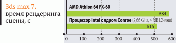 3ds max 7 – едва ли не «образцовое» приложение с точки зрения эффективности использования двухъядерных чипов. Во время рендеринга сцены он практически не зависит от производительности подсистемы памяти, а также кэш-памяти. Определяющими являются возможности ALU и FPU конкретного процессора, а также его частота. Как видим, Conroe и здесь на высоте.