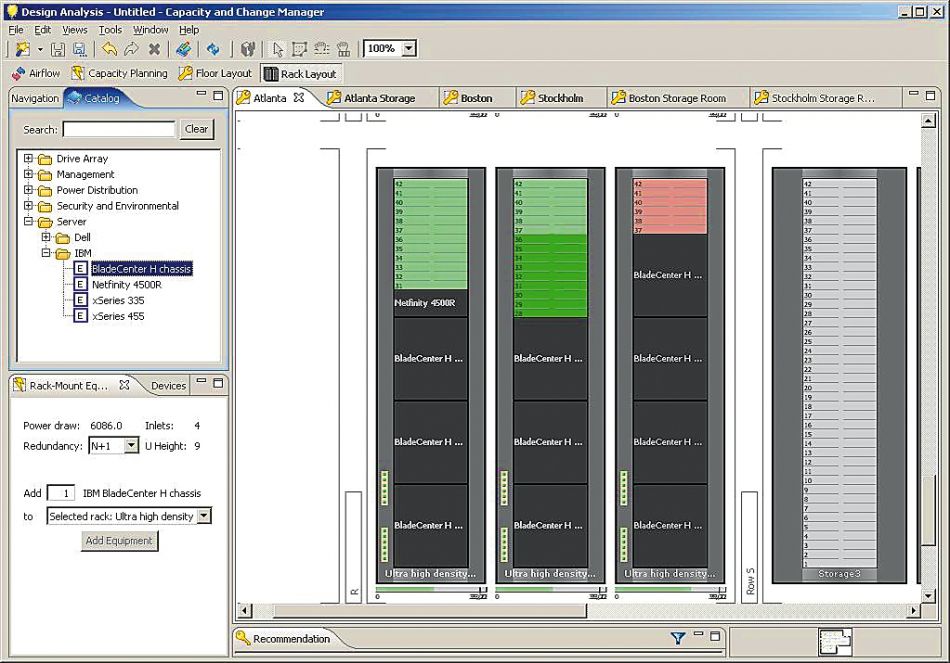 Capacity Manager может в графическом виде отслеживать ресурсы инженерной инфраструктуры ЦОД. Для этого требуется создать план помещения с расставленными шкафами и указать, какое оборудование в них установлено. При этом в состав данного ПО включен большой перечень серверного и телекоммуникационного оборудования, являющегося результатом совместной работы АРС и производителей IТ-оборудования, его характеристики (такие как потребляемая мощность, занимаемое пространство в шкафу, тепловыделение). Таким образом, формируется отчет, показывающий свободное место в шкафах, реальное потребление оборудованием (этот параметр Capacity Manager получает от блоков распределения питания с измерением потребляемого тока), а также запас по холодопроизводительности (параметр передается от интеллектуальных блоков кондиционирования). На основании данной информации администратор может принять решение, в какие шкафы установить дополнительное оборудование без риска перегрузки блока распределения питания или создания точек перегрева. А Change Manager в этом случае поможет спланировать, зафиксировать и документально провести в графическом виде его добавление.